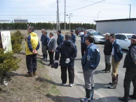 4月28日、作業開始前に事前の現地視察です。ふれあい実行委員会の清水副委員長からの説明を、真剣に聞き入る会員の面々。