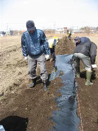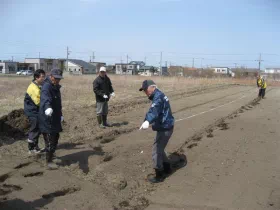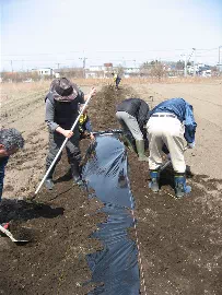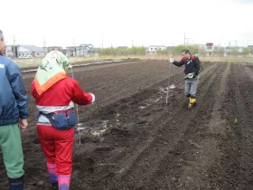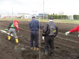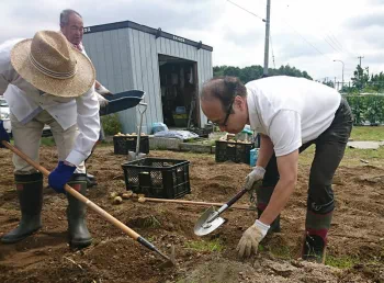 初日は、本物の牛糞を土に撒き、ジャガイモの種芋と大根の種まきです。中には疲労困憊の様子の方もいましたが、参加会員は終始笑顔で無事に初日の段取りを終了しました。