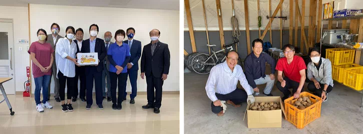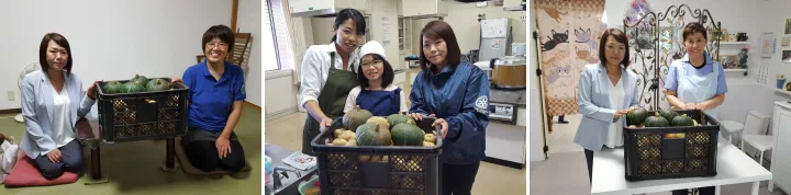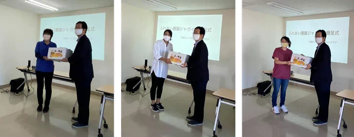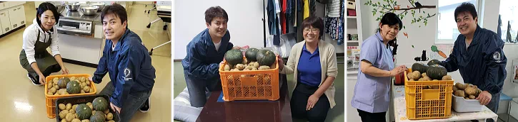 千歳市内の、こども食堂十彩さん・こども食堂スキップさん・こども食堂Cafe RESTさんに、収穫物を寄贈しました。(写真左から)