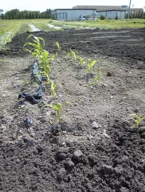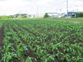 新たに黒土で整地されたエリアが、陥没箇所。飛び地状態の“とうもろこし達”。