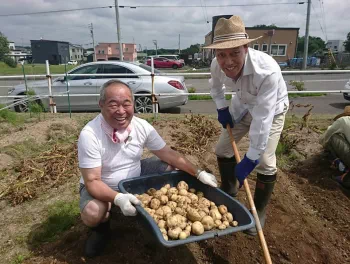 昨年からつくし保育園の園児を招き、ジャガイモの収穫体験を実施しています。今年4月に植えたジャガイモの収穫作業を、園児に体験してもらおうと企画したもので、千歳市高台のつくし保育園(梅原進園長)の年長・年中園児26人が参加しました。約30mの畝(うね)を掘り起こし、次々と現れる大小のジャガイモに歓声を上げながら収穫を楽しみました。