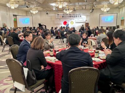 今宵は千歳市長横田隆一様はじめ市内各奉仕団体の役員様や、RI2510地区ガバナー玉井清治様をはじめ友好クラブのRI2620地区長泉ロータリークラブ、スポンサークラブの千歳ロータリークラブ、RI2510地区第7グループ内のロータリークラブ、千歳ロータアクトクラブの皆様をお招きし、「創立35周年記念式典ならびに祝賀会」を開催させていただきました。