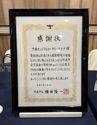 式典では物故会員への追悼から、スポンサークラブへの感謝状贈呈、千歳市奨学基金、米山梅吉記念館への寄附をさせていただきましました。