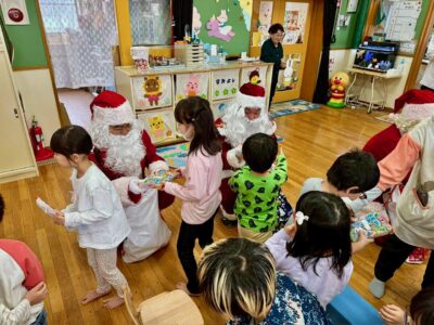 市内の保育園をロータリーサンタ達がプレゼントを渡しに回ります。