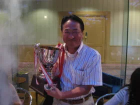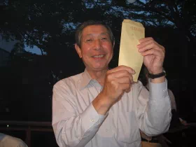 彦坂会員に還暦祝い’赤い帽子’が贈られました。