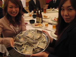 出席会員から千歳アクトクラブに支援金が贈られました。ニコニコ顔の福田幹事と山本会計(左から)