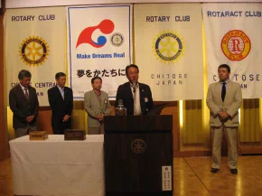 9月11日木曜日、ANAクラウンプラザホテルにて、千歳ロータリークラブ、千歳ローターアクトクラブとの3クラブ合同夜間例会が行われました。合同例会では『夜間例会』の開催は久しぶりのことです。当日の昼には親睦ゴルフコンペも行われ、会員相互の親睦を深めることが出来ました。また例会では、9月6日に開催された「市制施行50周年を祝う市民の集い」に多大なご支援を戴いたキリンビール㈱千歳工場様に実行委員会から感謝状を贈呈を致しました。