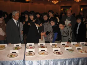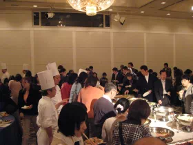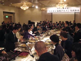 3月25日(木)、ホテル日航千歳を会場に、市民協働事業ちとせグルメの大試食会が開催されました。前売り入場券をお買求め頂いた100名の市民の皆様、出品者、関係企業・団体、山口市長はじめ千歳市関係職員の方々など大勢の参加者で盛大に行われました。