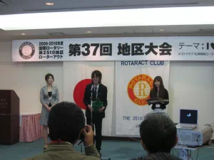 2010年6月26日 ルネッサンスホテルサッポロを会場に、札幌幌南ローターアクトクラブがホストクラブを務め行われました。 会場には、来賓、提唱ロータリークラブの幌南ロータリークラブの会長をはじめとする会員の皆さん、第2500地区のローターアクターと第2510地区のローターアクター100名以上が出席の中、熱気のこもった地区大会となりました。 次年度の地区ローターアクト代表は、千歳ローターアクトクラブの滝澤祐子さんです。