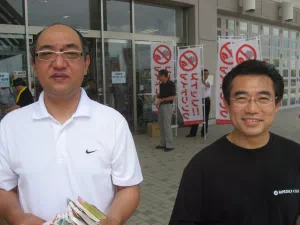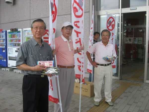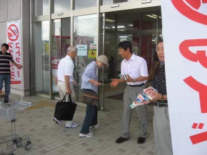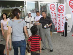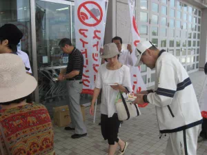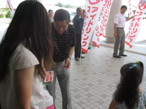 市内の大型店舗施設『ちとせモール』(勇舞8)で、エコプロジェクト「アイドリング・ストップ啓発活動」を行いました。この時季には珍しく最高気温が『30.6℃』となる炎天下、啓発サインののぼりを掲げ、日曜の昼に買い物に来店したたくさんの市民の皆さんに、啓発グッズ500セットを手渡しながら啓発活動を実施しました。
