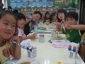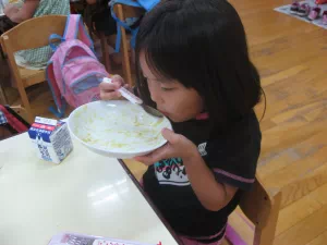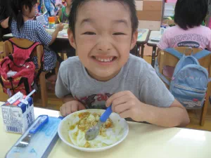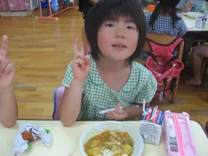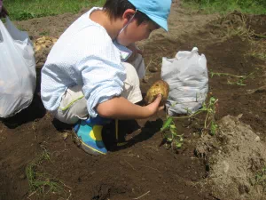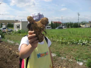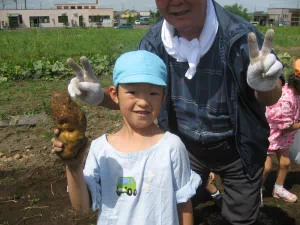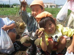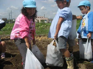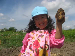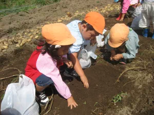 2010年8月26日 8月26日(木曜日)午前、つくし保育園の園児と一緒に、児童育成プロジェクト「自耕体験ふれあい農園」を実施しました。当初は、24日の予定でしたが、雨に見舞われこの日の実施となりました。晴天、絶好のジャガイモ堀り日和となりました。園児等はなんと素手でジャガイモ堀りに熱中、袋いっぱいの収穫でした。 この日は、『ふれあい農園産』のジャガイモを食材に調理したカレーライスが、保育園の給食メニューです。