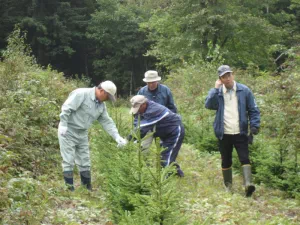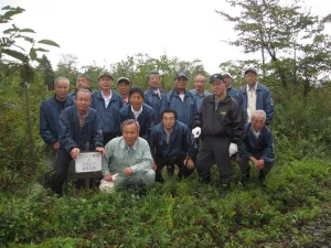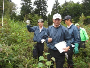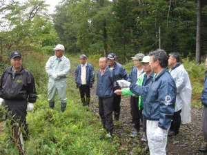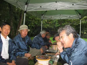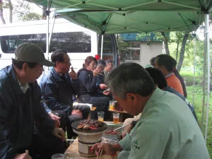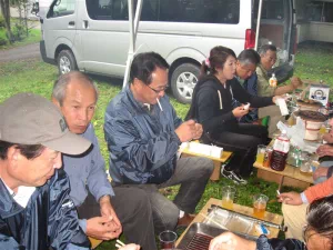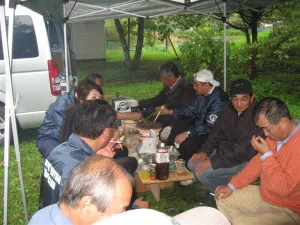 2010年9月28日 移動例会「支笏湖周辺台風災害・復興の森づくり/成長観察・記録会」です。2007年5月に880本のアカエゾマツを植樹して以来、毎年1~2回の作業・観察を実施しています。25cm程だった苗木は、1m位までに成長しました。 作業終了後は、場所を移動し恒例の「親睦バーベキュー会」です。今回は、梅原会員の事業所「つくし学園」の管理地を提供して頂いての開催でした。あいにくの雨天でしたが、賑やかに行われました。