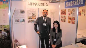 第2510地区 財団学友委員会の展示ブース地区 財団学友委員長の斉藤博司会員(左)