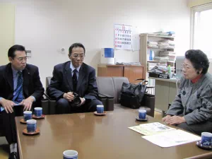 須藤エコプロジェクト実行委員長(左)、梅原つくし保育園園長(中)と大古瀬実行委員長(右)