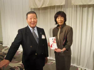 18年間、事務局員として勤めて頂いた沖野さんが退職です。会員の感謝の気持ちを、初代会長の高塚会員が代表し記念品のプレゼント。