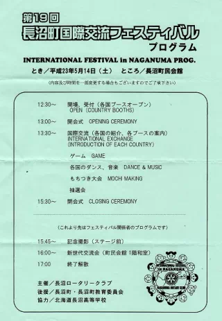 国際交流フェスティバルは、長沼町内の児童・生徒に国際性や世界理解を身に付けさせようと、長沼RCが毎年開いています。国際ロータリー第2510地区でRCの交換留学生や米山奨学生として外国から来道している人たちを招いて交流。今回は、震災の影響で帰国した留学生もいましたが、札幌や室蘭などから11カ国32人の留学生らが参加しました。千歳、恵庭などのロータリークラブの役員や札幌など近隣の市町で生活している留学生らが、町内の小中高生と交流しました。