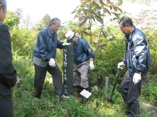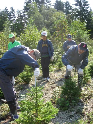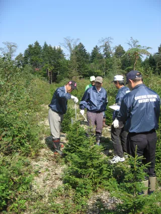 大変良い天気に恵まれました。2007年に植樹したアカエゾマツの苗木は、昨年40㎝程でした。今回はその先の成⻑した部分を調査し記録して頂きます。また、「友好の森」の看板を鈴木会員が作ってくださいました。こちらの設置も⾏いたいと思います。作業終了後は梅原会員に提供して頂いた、つくし保育園蘭越園庭にてバーベキューを⾏います。では、皆さん宜しくお願い致します。