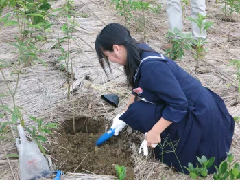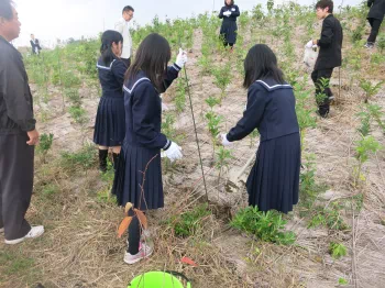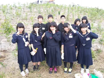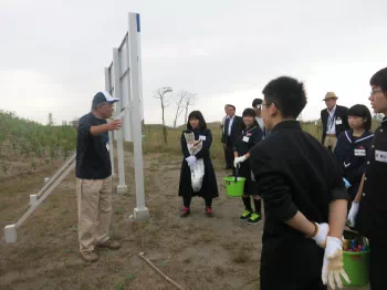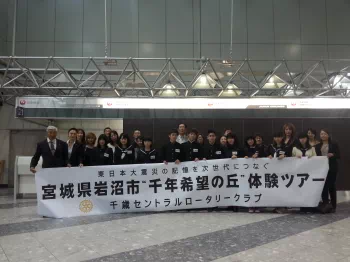 初日は、被災した臨空工業団地、玉浦中学校、岩沼市役所などを訪問。玉浦中学校では、クラブ自家農園で収穫した南瓜を献立にした『給食』を、在校生と共に頂き交流を深めました。また、当日は震災命日(11日)であり震災発生の午後2時46分に『千年希望の丘』で黙祷・献花を行い、その後も慰霊碑などを訪れました。二日目は、震災から復興と防災面で計画している防潮堤『千年希望の丘』で植樹作業を行い、岩沼市内と近郊の被災や復興の状況を見学、地元の方々との懇談、交流をしました。