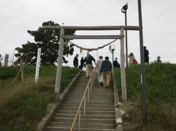 大正9年、船の出入り、気象、海上などを見るために在郷軍人分会が声をあげて、日和山建設計画が発起されました これに多くの人々が賛同し、勤労奉仕によって工事が進められました この建設には、中島町の命名者として知られる当時の第2師団長・中島正武中将も加わったそうです 山頂には、湊神社から遷座された海を守る弁天様を祭る富主姫神社の社殿と、地域の氏神様として信仰があり、震災後に遷座した閖上湊(みなと)神社があります