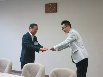 千歳セントラルロータリークラブから岩沼市「千年希望の丘」整備復興寄付に寄付金を菊池啓夫岩沼市副市長(現市長)に手渡す武田会長