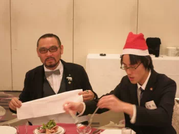 今夜の立役者、親睦活動委員会の笹谷委員長(中)、