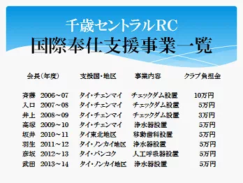 そして、2006年の斉藤会長の年度から第2510地区の国際奉仕事業に継続して協力支援を実施しています。 クラブとしては毎年3~10万円を拠出しているだけであり、直接には奉仕事業に携わっておりませんが、田口さんには大変ご苦労をお掛けし長年支援をさせて頂いております。