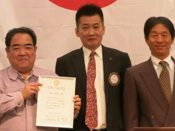 武田会長(中央)から新会員研修の修了証を受け取る四方会員(左)、
