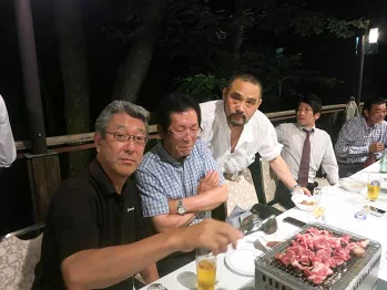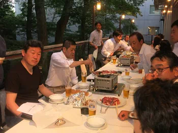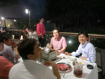 本日(7月15日)は屋外テラスに会場を移し、新会員の小松義徳会員、本村和貴会員の歓迎会です。また、新会員予定者として岩室秀典さんが参加されています。絶好のバーベキュー日和となりました。皆さんお楽しみください。