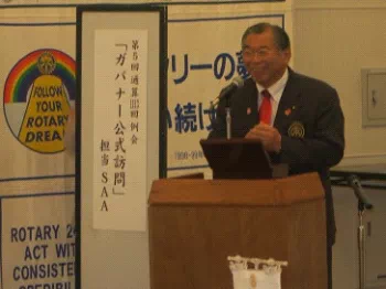 二番目にはロータリーファミリーを通じて会員増強を願っています。ホァンRI会長はロータリーには約120万人の会員がおられますが、130万人、つまり10万人増員を考えています。ロータリーの友8月号には会員増強について書いてありますが、その中には家族まずあなたの奥さんを入会させなさいと書いてあります。ロータリーファミリーというのは、ローターアクト、インターアクト、財団奨学生、米山奨学生、LYRA修了者、どんな人でも会った人をロータリーファミリーと呼ぶそうです。こういう方をロータリーに迎えて欲しいと言うのがホァンRI会長の大きな目標の1つです。しかしこれを私のクラブの会員に話したら、うちは奥さんを入れたら大変な事になるから駄目だと言っていました。今日こちらのクラブに来て女性の会員がおられ何かいいと思いました。ニコニコBOXで「お願いします」と言っている姿にあれだと思いました。やはりこれからは女性の時代です。どうか女性の方に会員になっていただけるようお願いします。