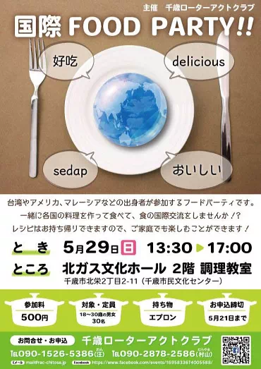 千歳ローターアクトクラブから「国際 FOOD PARTY」の案内と支援金協力のお願いがありました。