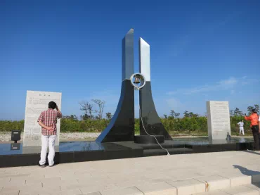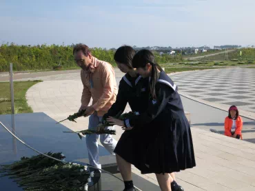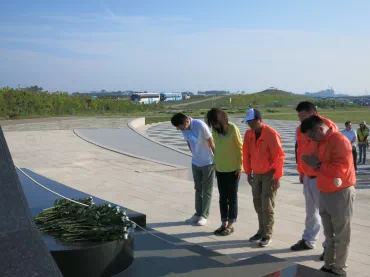 慰霊碑は、この地域を襲った8メートルの津波を忘れぬよう、台座を含め、ほぼ同じ高さです。犠牲となった市民ら155人の名前を刻んだ碑もそばに建てられ、周囲に造成された千年希望の丘3基が見渡すことができます。犠牲になった方々のご冥福を祈り、献花を行いました。