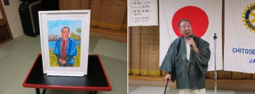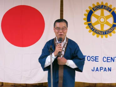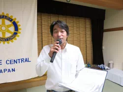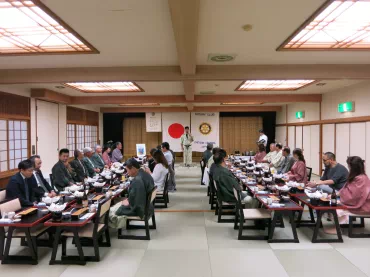 本日、会場をご提供いただいた丸駒温泉代表 佐々木義朗様よりご挨拶を頂戴しました。我がクラブはこれまで丸駒温泉で4度例会を開催し、今回が5度目となること。そして、ご逝去された先代のお父様に最近顔が似てきたと言われることを嬉しく思うとのこと。また懐かしいエピソードをご紹介いただきながら、先代金治郎社長の人柄を偲びました。この後、最後まで例会に参加していただきました。