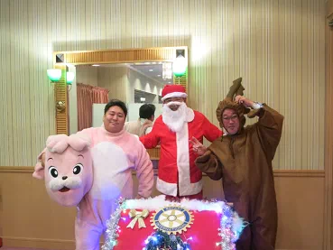 トナカイは臼田会員、ウサギは山口会員、トナカイとウサギに引かれたそりに乗ってサンタクロースが入場しました。サンタクロースの四方会長が子供たちへお菓子をプレゼント(^^)