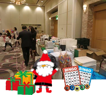 こんばんは。メリークリスマス。本日のクリスマス家族会においで頂きありがとうございます。例年より家族の方の参加が多く、1卓増えています。大変嬉しく思っています。みなさん、お菓子の帽子貰いましたか?横に景品が沢山並んでいます。他にまだあります。親睦委員会が中心で準備して参りました。今年度は石川委員長で女性ならではの特徴のあるクリスマス会だと思います。十二分に楽しんで行って下さい。