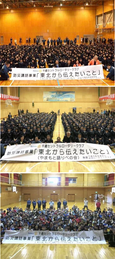 19日は千歳高校1、2年生の約700名、20日は千歳北陽小学校4年生の約240名、千歳勇舞中学校1、2年生の約500名に「やまもと語りべの会」の渡邉修次様の講話を聞いて頂きました。ご協力いただいた岩沼ロータリークラブの渡辺真多会長、小野照代パスト会長にも各校に足を運んで頂きました。真剣な表情で講話を聞いていた生徒の皆さん。震災の教訓を伝える貴重な時間となりました。