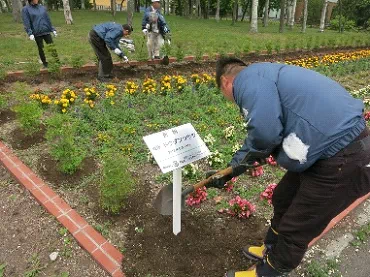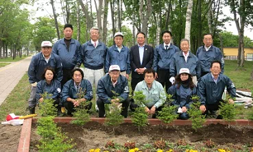 今年度3月に実施した防災講話事業「東北から伝えたいこと」を記念し、ドウダンツツジの苗60本を千歳市に寄贈しました。 ロータリー財団地区補助金を活用して行ったものです。 6月19日、会員の手により千歳市朝日町のグリーンベルト花壇に植樹しました。既に植えられていた色とりどりの花を囲むように樹高30センチほどの苗を植えました。