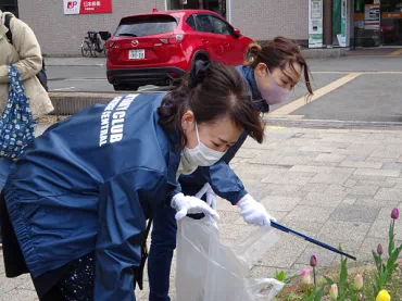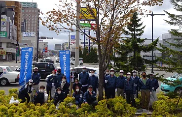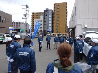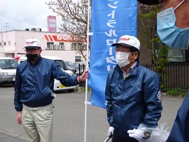 コロナ禍の中でありますが、今日は大勢の方々にご参集頂けました。ありがとうございます。恒例の年2度の清掃奉仕、今回は春の清掃です。千歳駅周辺を清掃します。作業後、駅前の友好クラブ記念樹である「友情の桜の木」の前で集合写真を撮りたいと思います。宜しくお願いします。